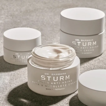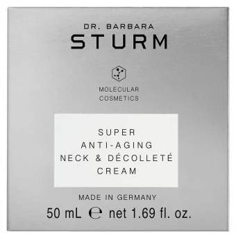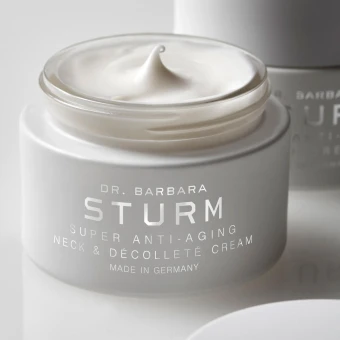 Dr. Barbara Sturms SUPER ANTI-AGING NECK & DÉCOLLETÉ CREAM ist das neueste Produkt der beliebten SUPER ANTI-AGING COLLECTION. Sie enthält eine hohe Konzentration an wirkungsvollen Inhaltsstoffen, die auf die spezifischen Bedürfnisse der Haut von Hals und Dekolleté abgestimmt sind. Ceramide und nährende Lipide aus Sheabutter, Marulaöl und Mangosamenöl unterstützen die hauteigene Lipidbarriere und der kraftvolle Anti-Aging Wirkstoff Purslane enthält hautschützende Antioxidanzien. Kaktusfeige und Hyaluronsäure spenden intensive Feuchtigkeit und glätten die Haut, während Mangostan zusätzlich einen aufpolsternden Effekt besitzt und ein Extrakt aus dem Shiitake-Pilz die Haut strafft und festigt. Kombucha- und Gänseblümchen-Extrakt runden die Inhaltsstoffwissenschaft ab, indem sie den Hautton ausgleichen und helfen, das Auftreten dunkler Flecken zu verringern. Bei regelmäßiger Anwendung hinterlässt die SUPER ANTI-AGING NECK & DÉCOLLETÉ CREAM eine ebenmäßige, glatte und jugendlich aussehende Haut.