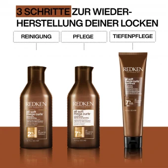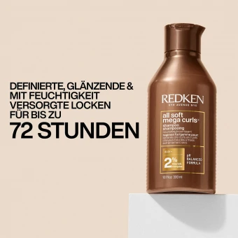 Redken’s All Soft Mega Curls ist eine Pflegeserie für sehr trockene Locken. Bei Anwendung des kompletten Systems aus Shampoo, Conditioner und Leave-In werden die Locken intensiv gepflegt, mit Feuchtigkeit versorgt, definiert, entwirrt und erhalten ein geschmeidiges und glänzendes Finish.