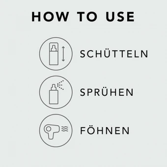 - 3.SCHÜTTLE gründlich und sprühe mit circa 15 cm Abstand gleichmäßig vom Ansatz zu den Spitzen auf das feuchte Haar auf. Für optimale Resultate 1x wöchentlich anwenden. Nicht ausspülen.